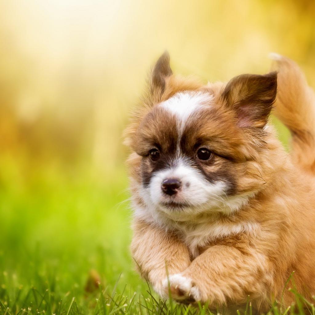 Обои Забавный щенок вельш-корги бежит по зеленой траве