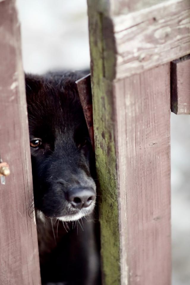 Обои Любопытный черный пес заглядывает в щель в заборе