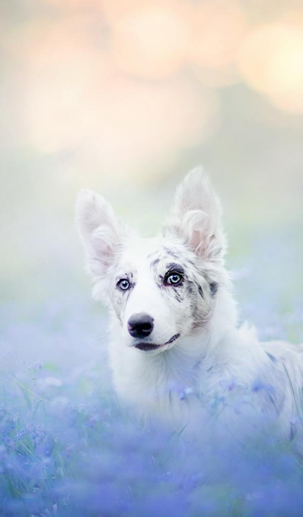 Обои Австралийская овчарка гуляет по голубым полевым цветам