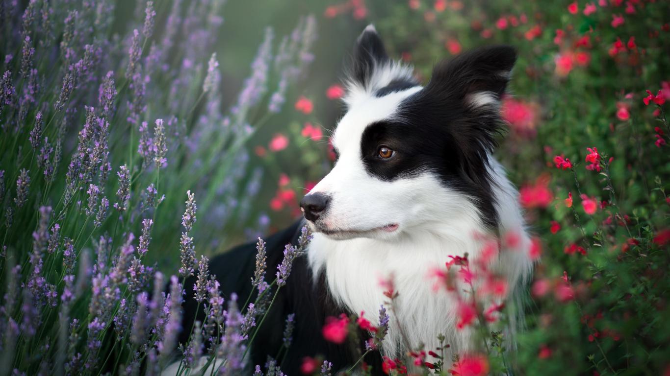 Обои Собака породы Бордер-Колли сидит в полевых цветах