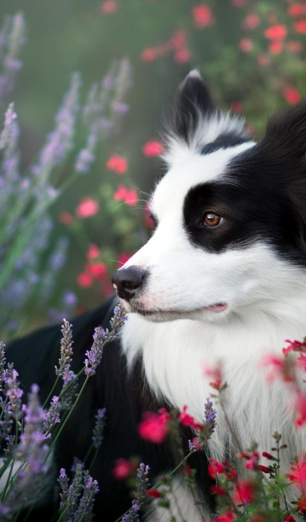 Обои Собака породы Бордер-Колли сидит в полевых цветах