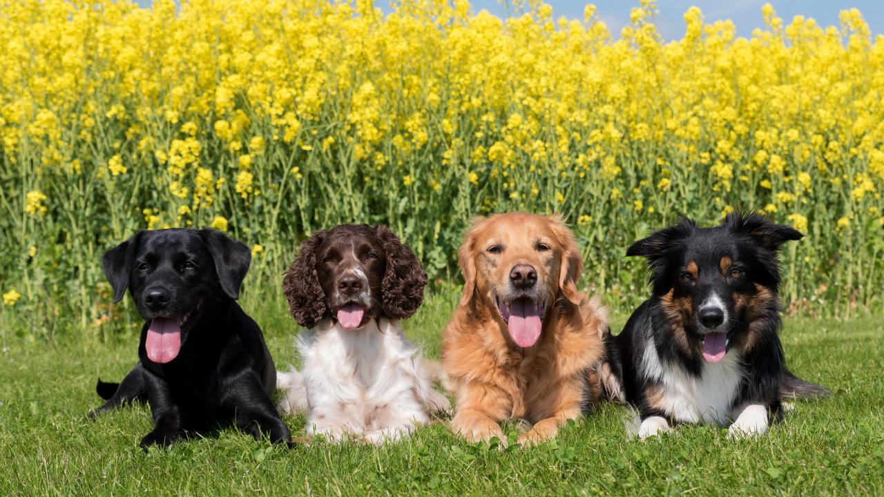 Обои Четыре породистых собаки лежат на зеленой траве у желтых цветов