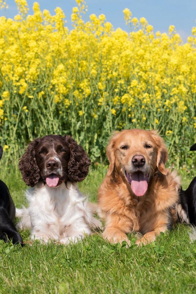 Обои Четыре породистых собаки лежат на зеленой траве у желтых цветов