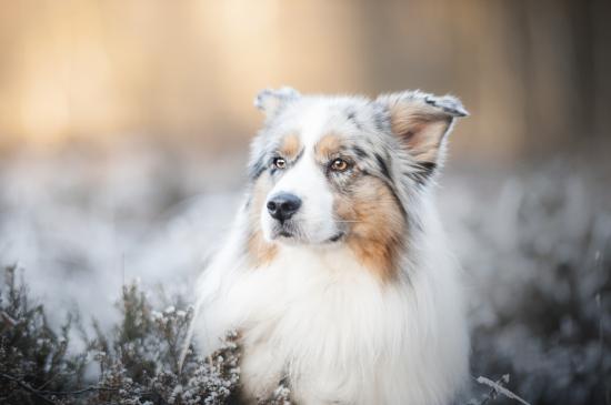 Обои Австралийская Овчарка с серьезной мордой лежит на земле