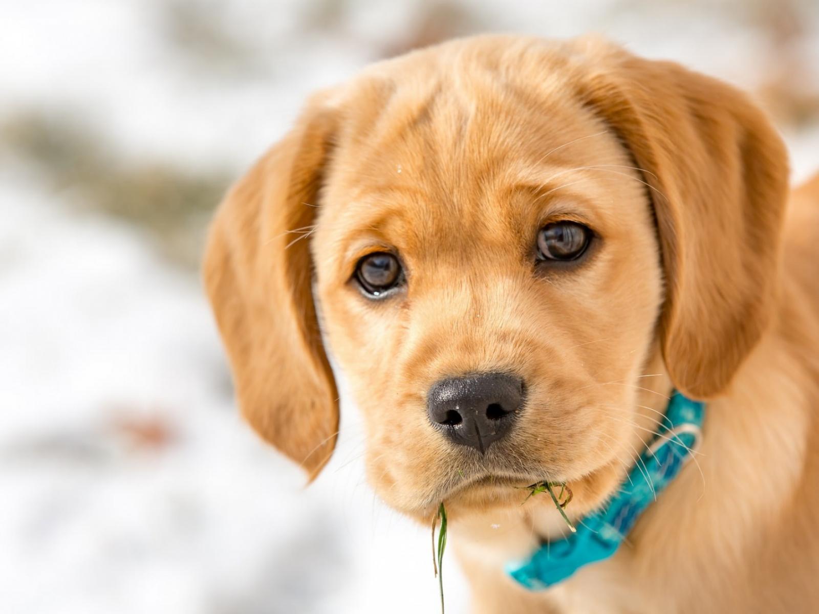 Обои Маленький грустный щенок в голубом ошейнике