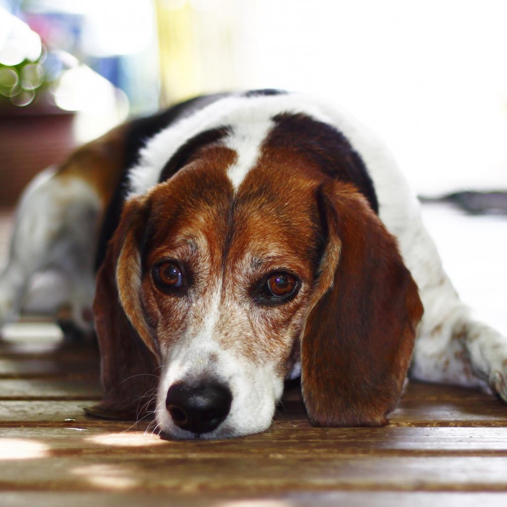 Обои Грустная собака породы бигль лежит на деревянном полу