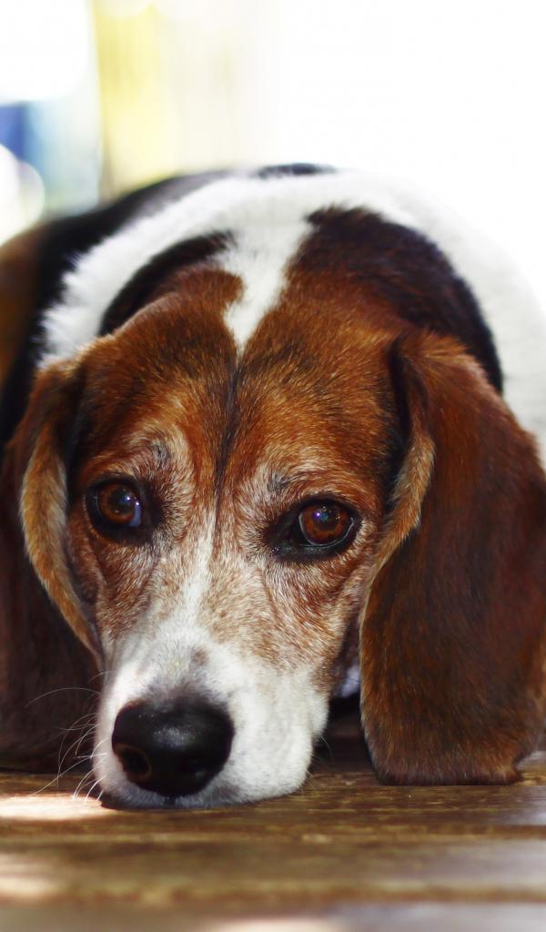 Обои Грустная собака породы бигль лежит на деревянном полу