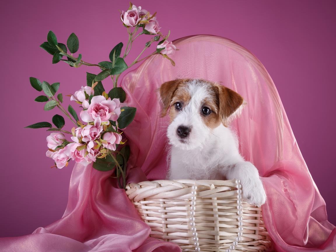 Обои Щенок силихем-терьер в розовой корзине с цветами