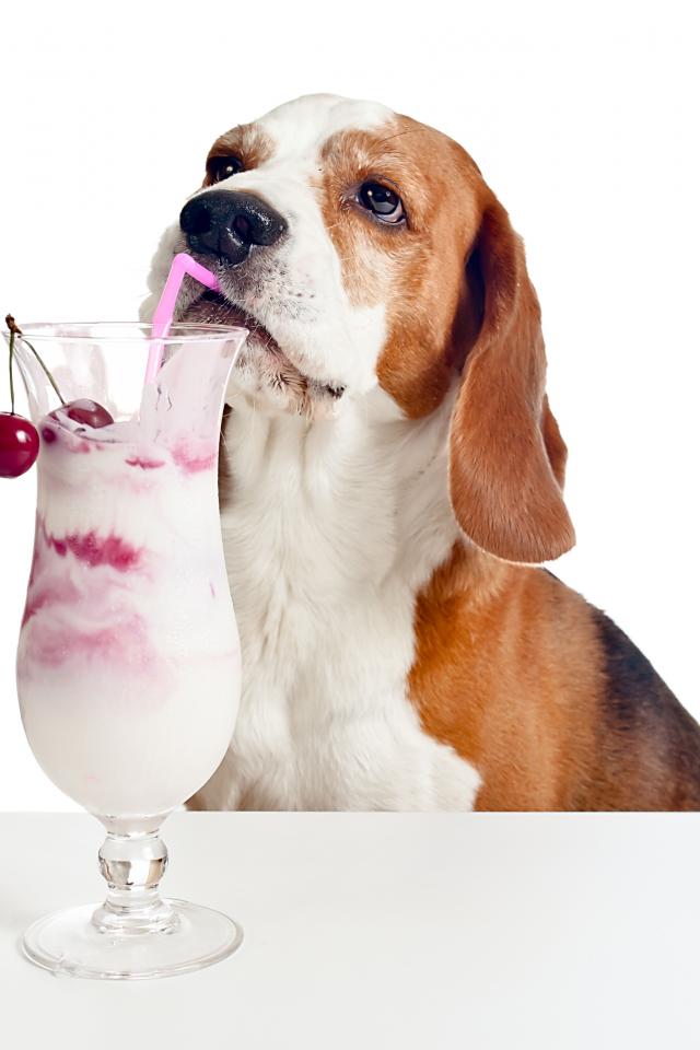 Обои Собака породы бигль с вишневым коктейлем на белом фоне