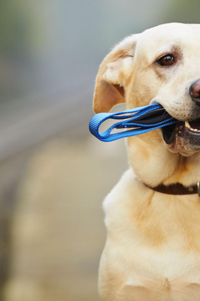 Обои Грустный лабрадор сидит на дороге с синим поводком в зубах