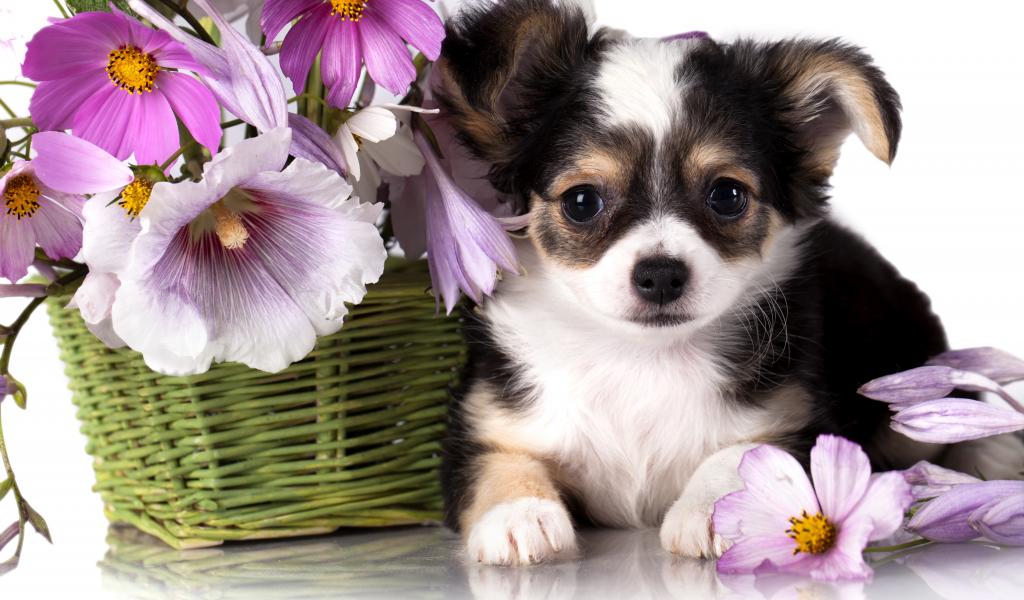 Обои Маленький щенок чихуахуа с корзиной цветов космеи