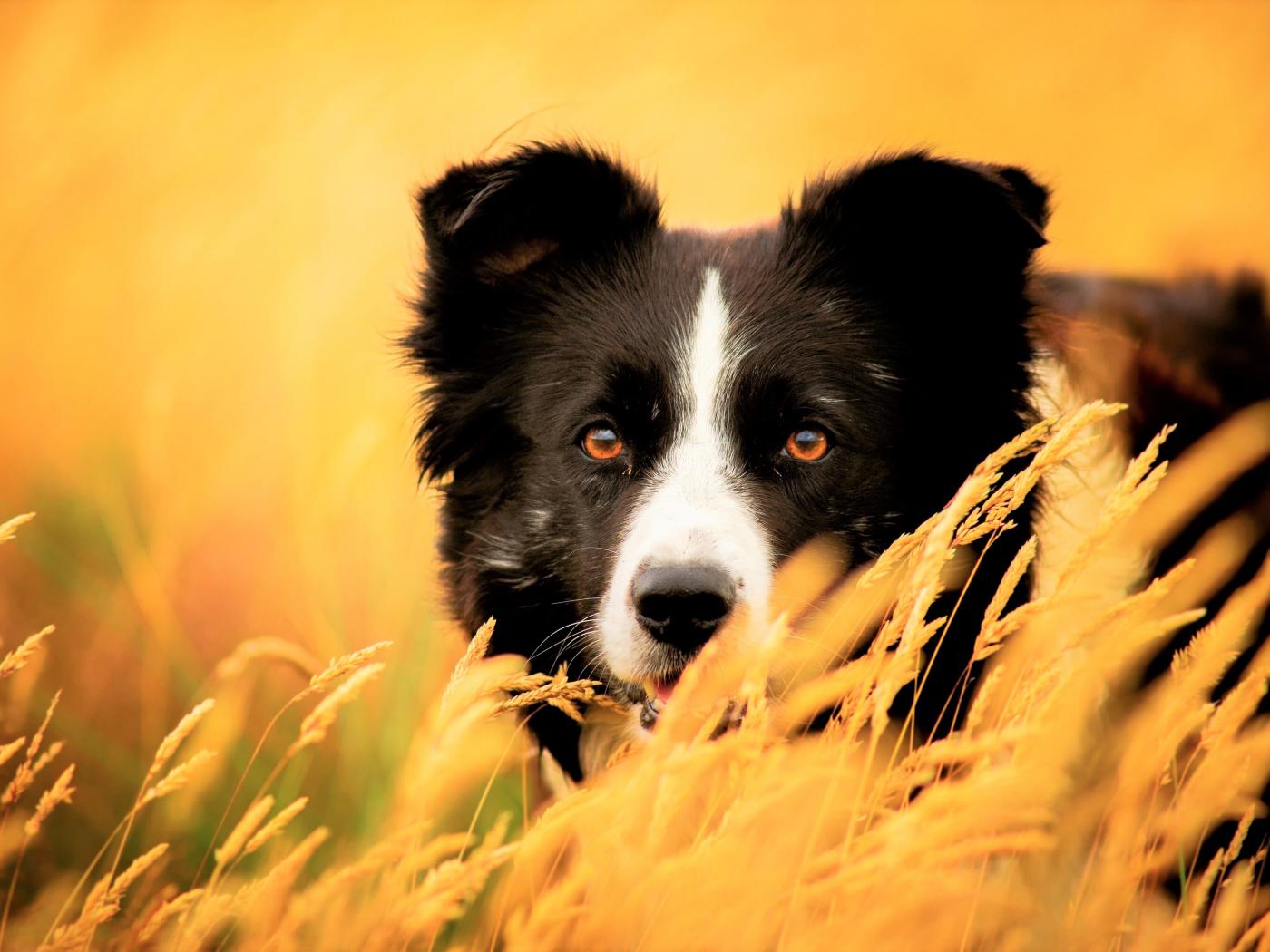 Обои Собака породы бордер колли сидит в сухой траве