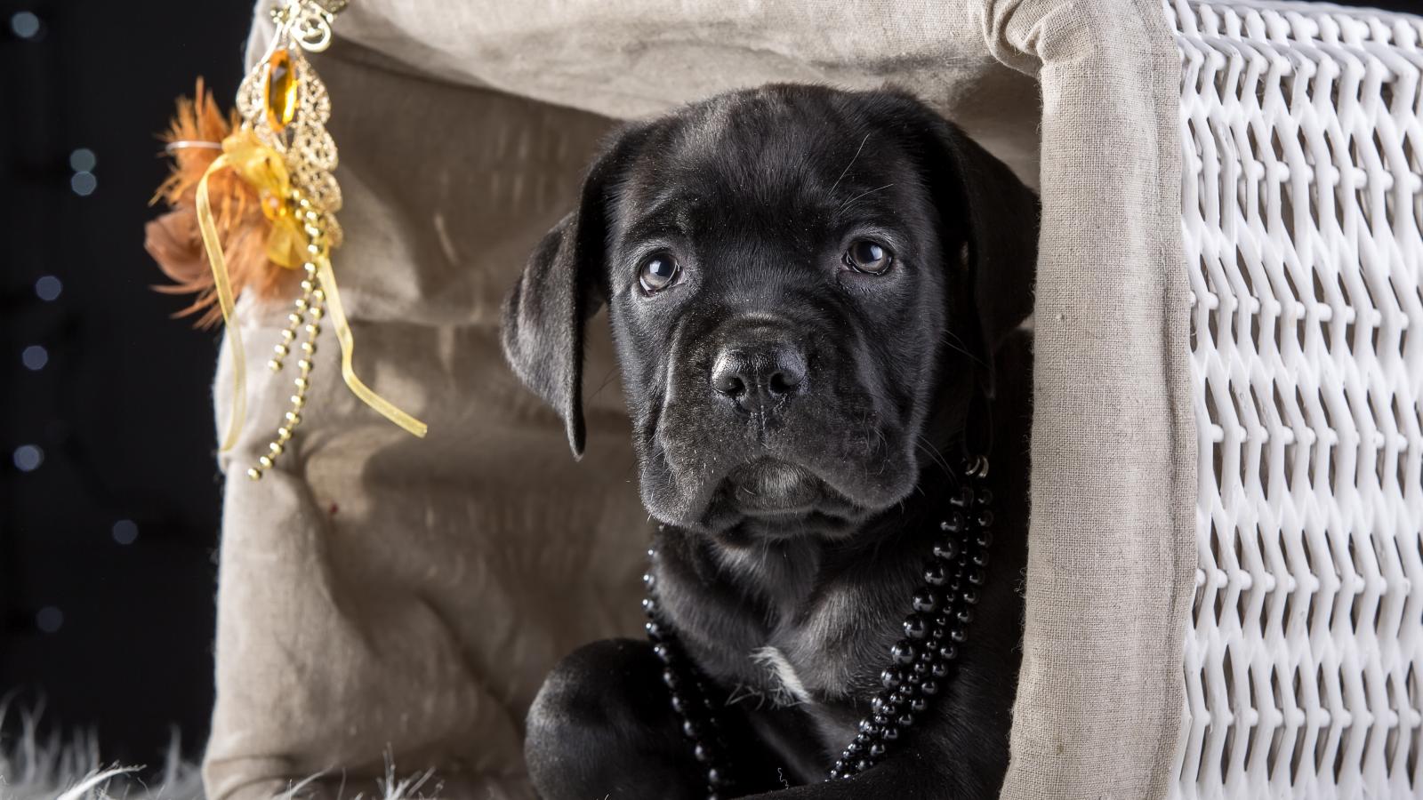 Обои Черный щенок Кане корсо в корзине