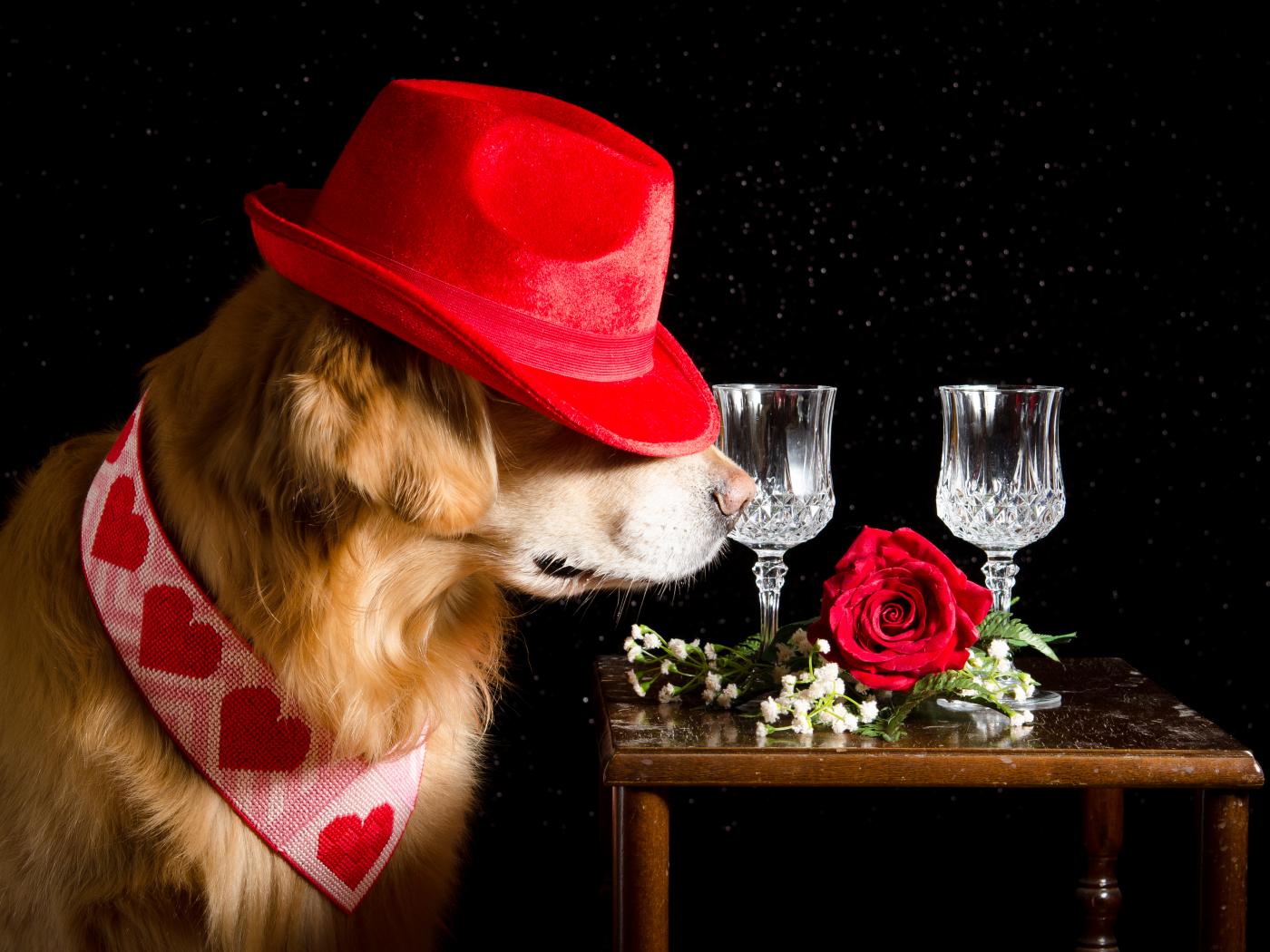 Обои Золотистый ретривер в красной шляпе у стола