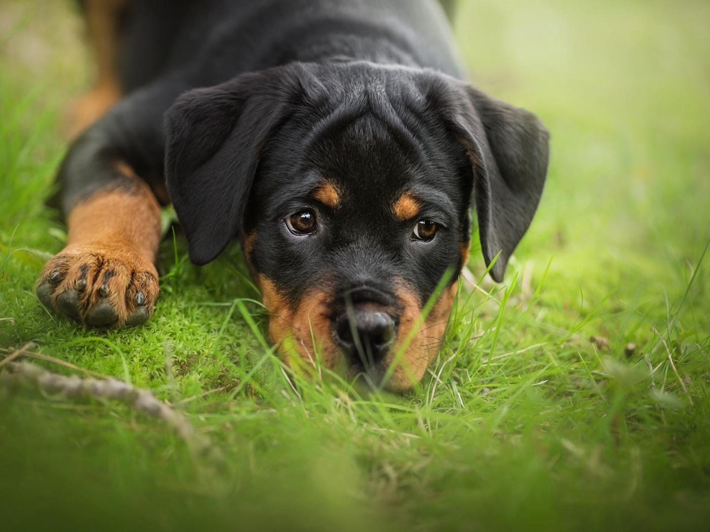 Обои Грустный щенок ротвейлера лежит на зеленой траве