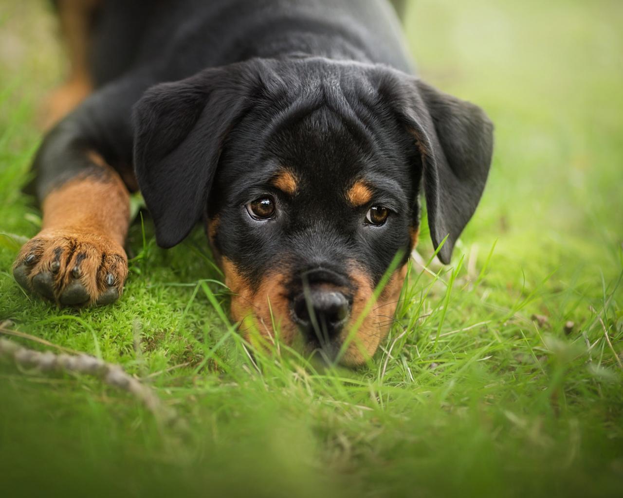 Обои Грустный щенок ротвейлера лежит на зеленой траве