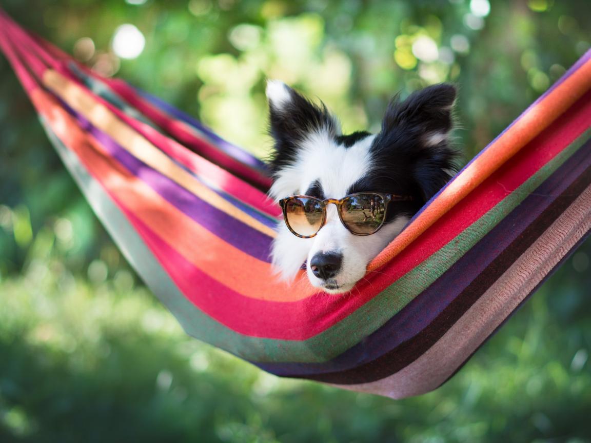 Обои Собака породы Бордер-колли в очках лежит в гамаке