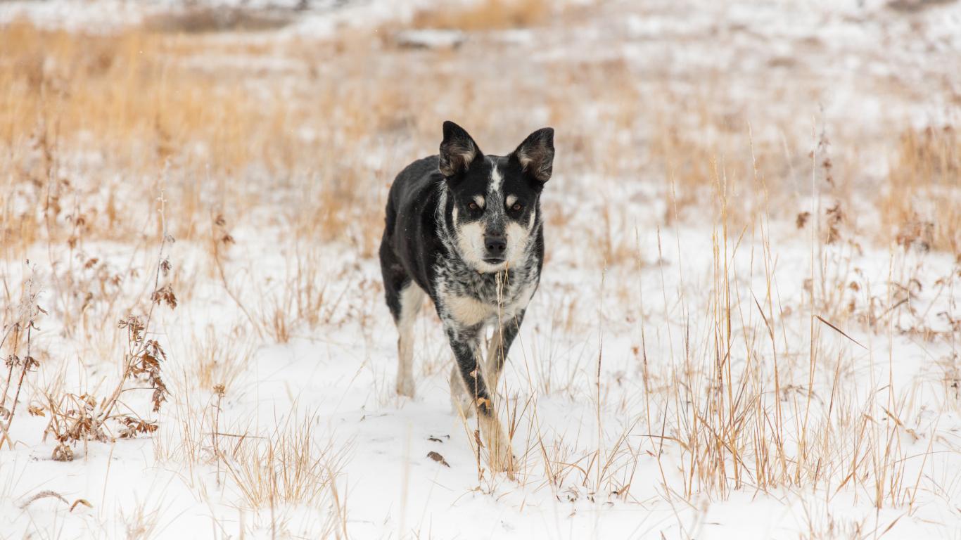 Обои Собака идет по покрытой снегом траве