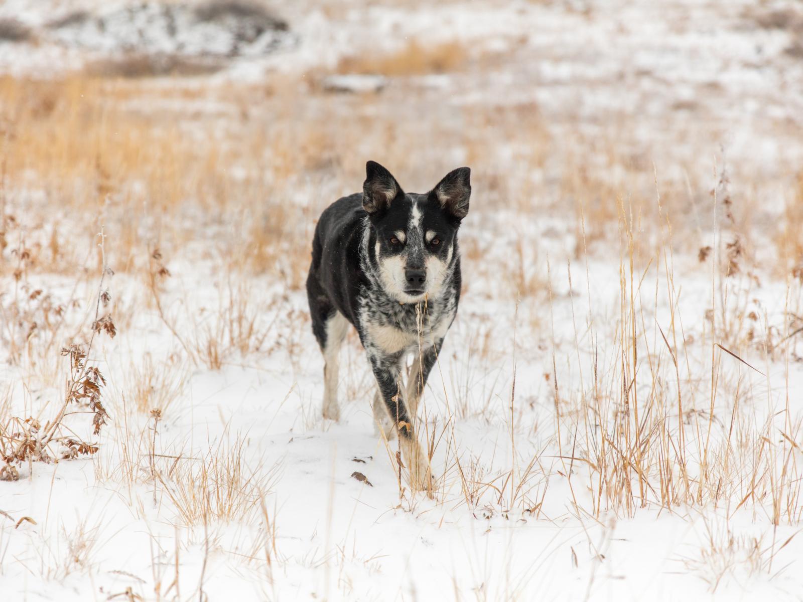 Обои Собака идет по покрытой снегом траве