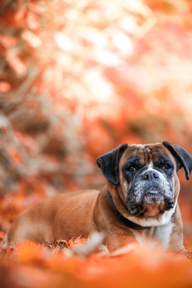 Обои Грустная собака породы боксер лежит на опавшей листве