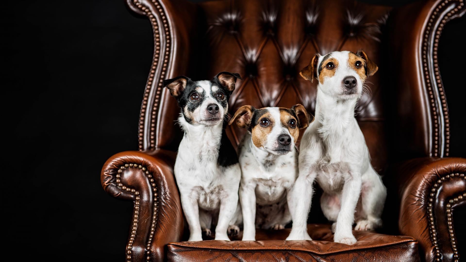 Обои Три собаки породы Джек-рассел-терьер сидят на кожаном кресле