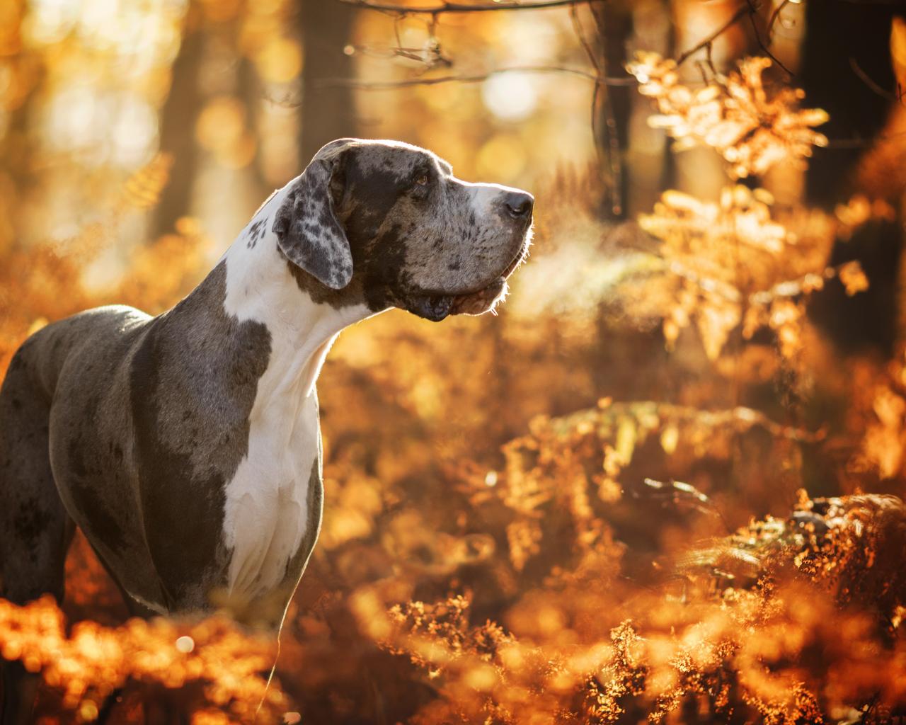 Обои Большой Немецкий дог гуляет в осеннем лесу