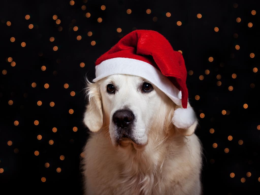 Обои Золотистый ретривер в шапке Деда Мороза на Новый год