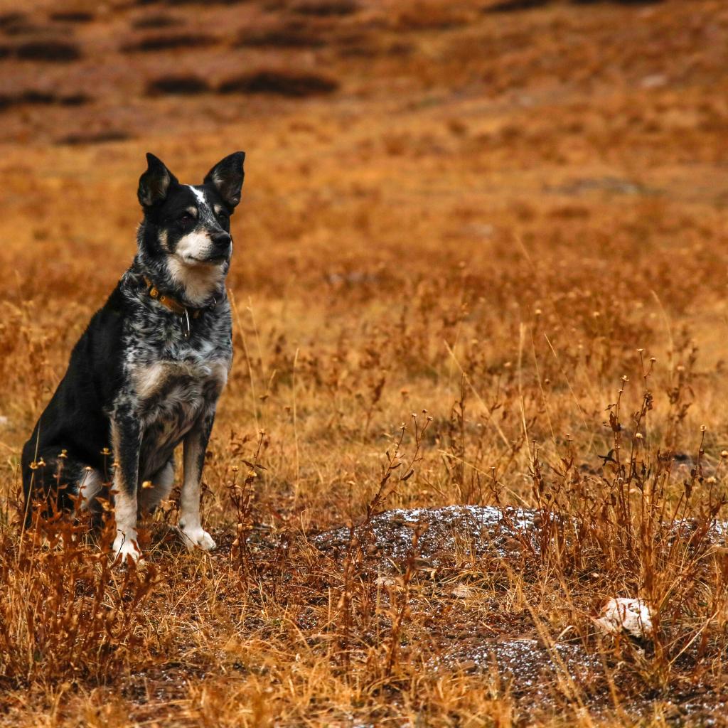 Обои Собака с умной мордой сидит на сухой траве