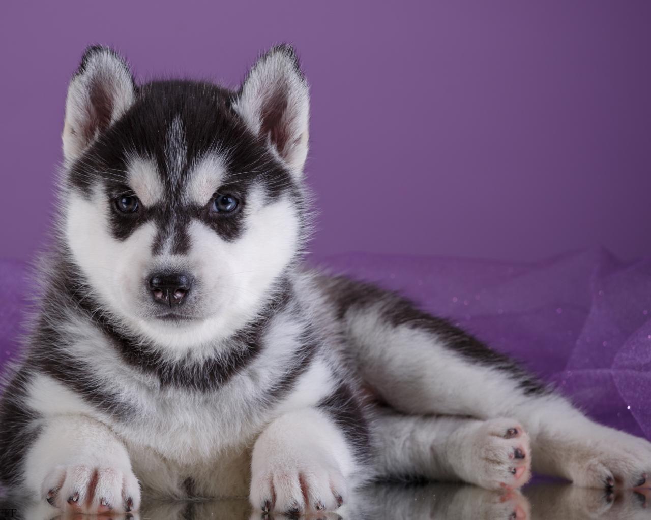 Обои Серьезный щенок хаски лежит на фиолетовом фоне
