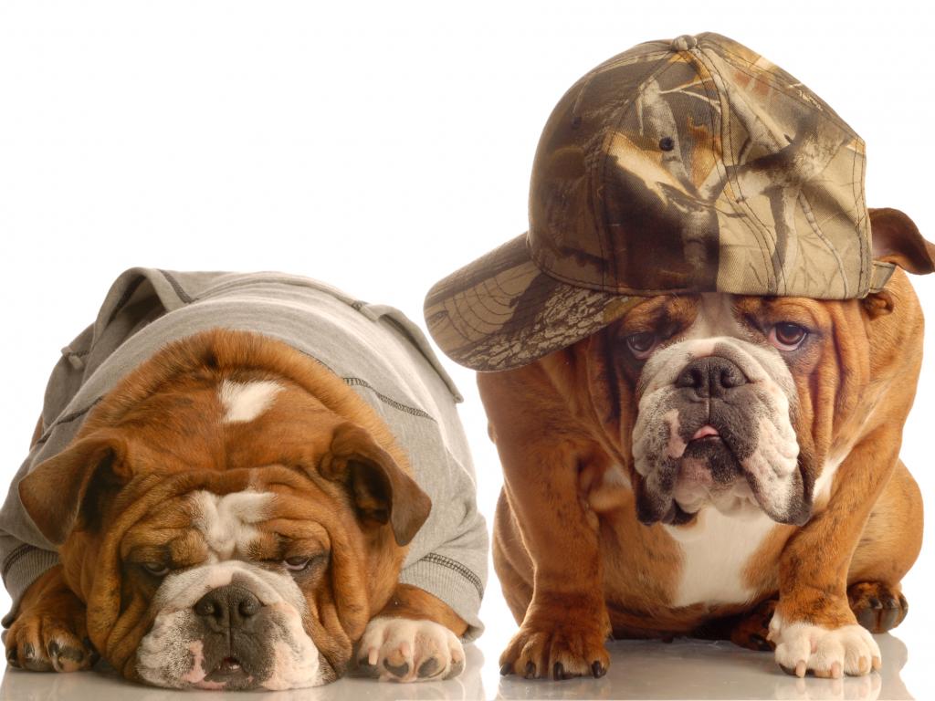 Обои Грустные бульдоги в костюмах на белом фоне