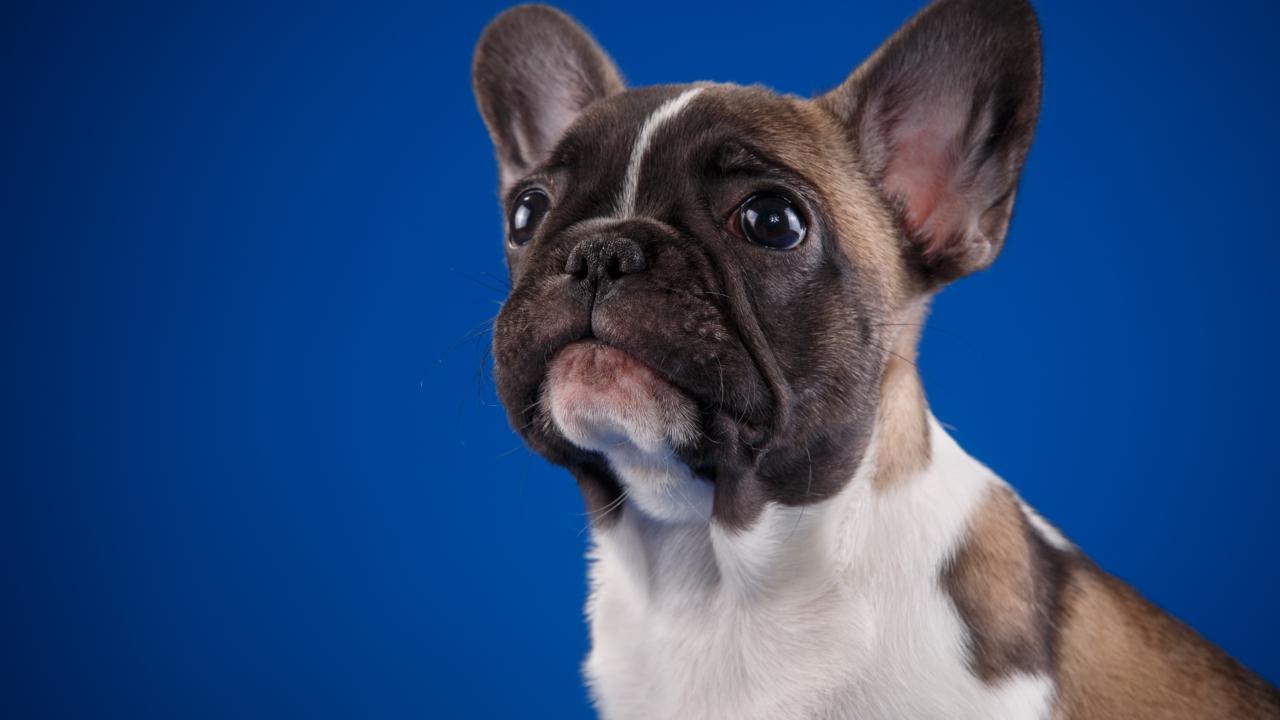 Обои Грустный маленький французский бульдог на голубом фоне