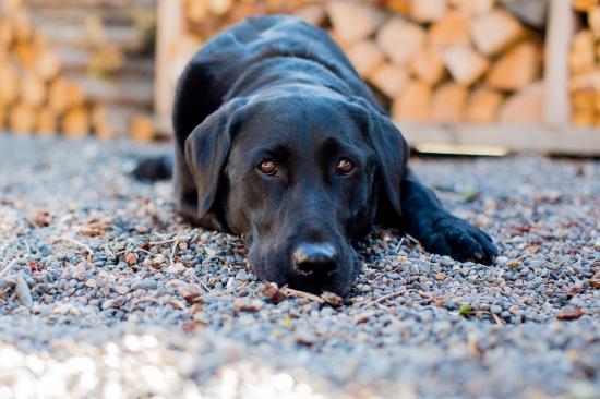 Обои Грустный черный лабрадор лежит на мелких камнях