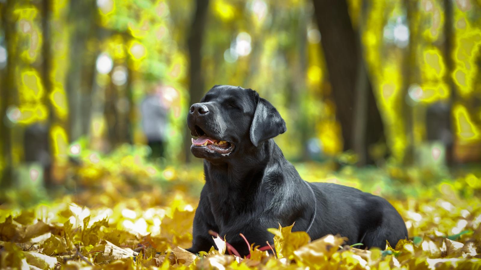 Обои Черный лабрадор отдыхает на опавшей желтой листве