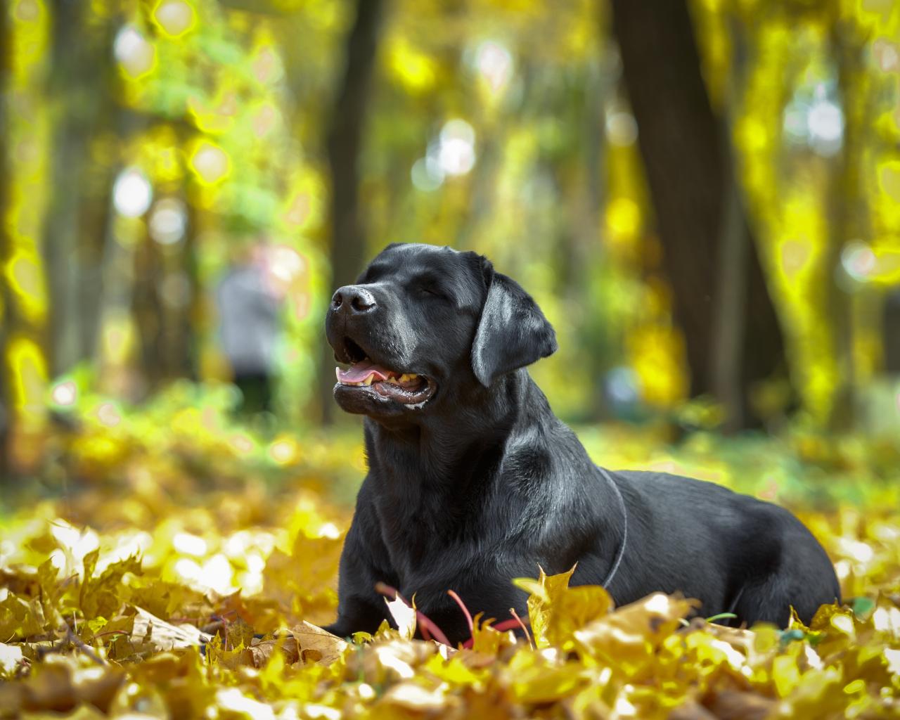 Обои Черный лабрадор отдыхает на опавшей желтой листве