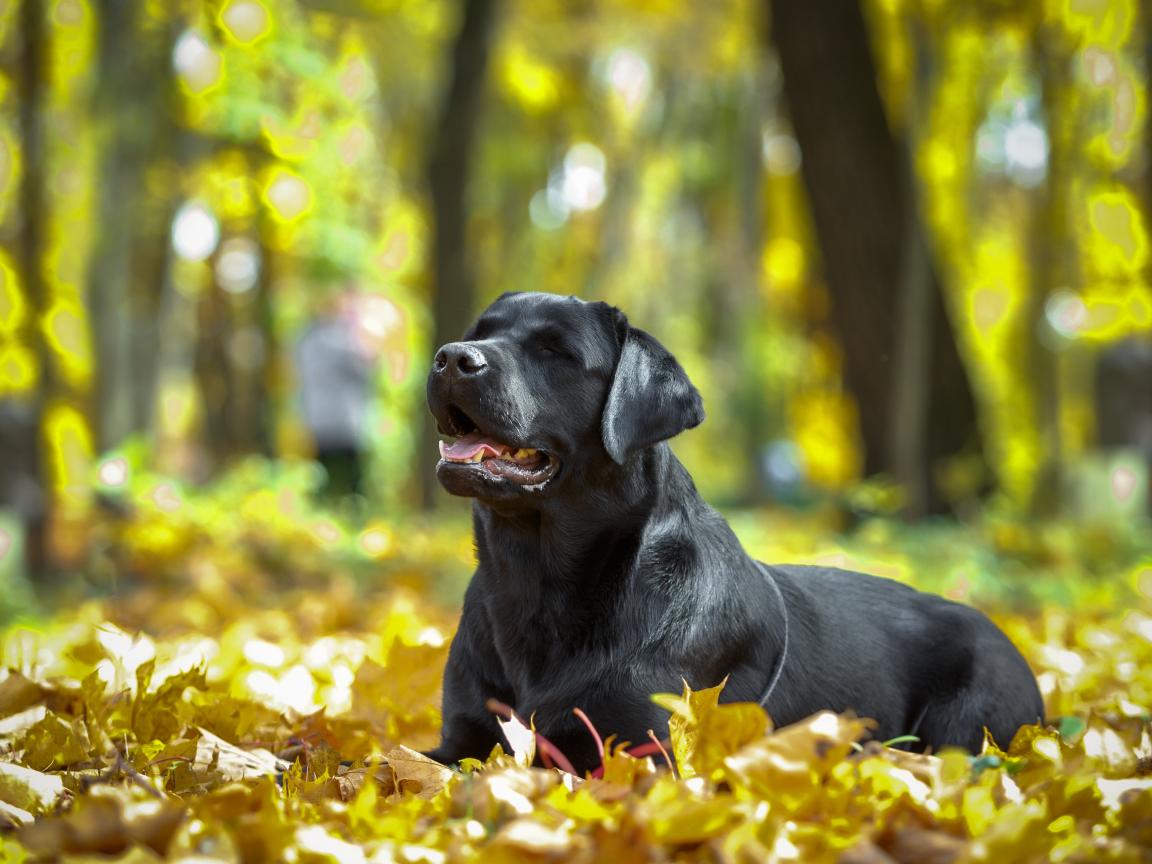 Обои Черный лабрадор отдыхает на опавшей желтой листве