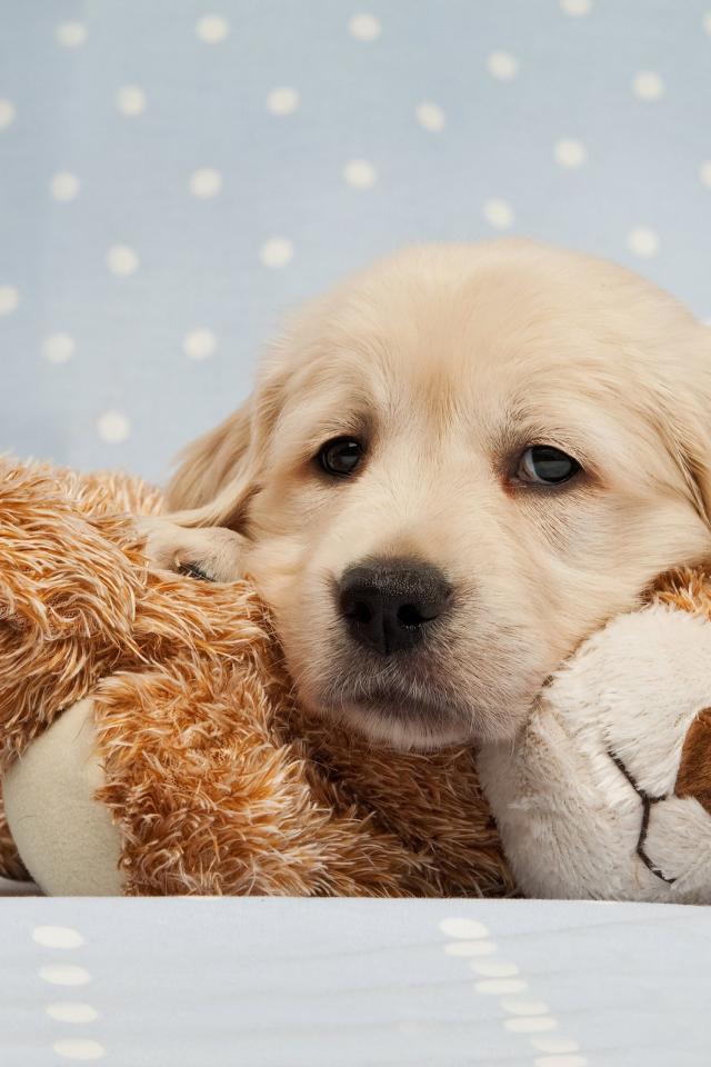 Обои Грустный щенок золотистого ретривера лежит на мягкой игрушке