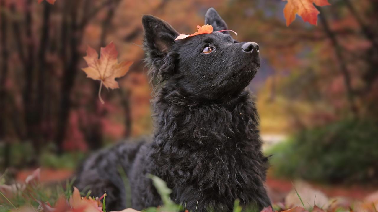 Обои Черная собака породы бордер колли лежит на опавшей листве
