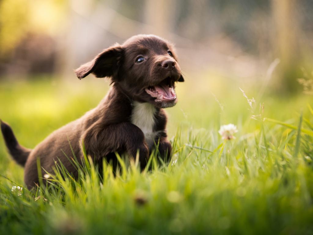 Обои Маленький веселый щенок спаниеля бежит по зеленой траве