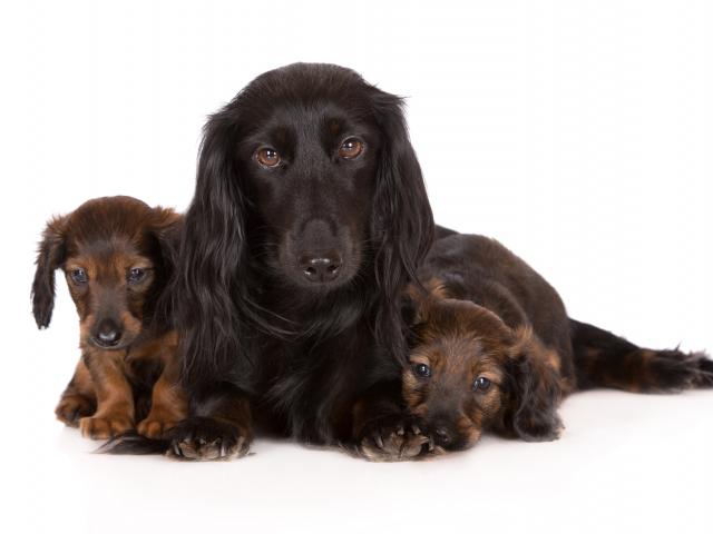 Обои Такса с двумя забавными щенками на белом фоне