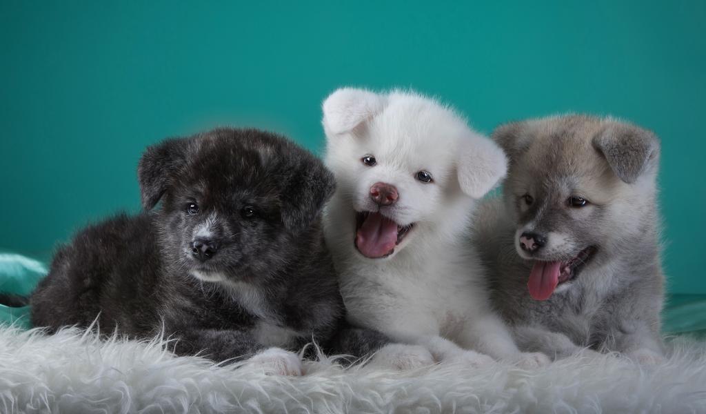Обои Три забавных щенка Акита-ину на зеленом фоне