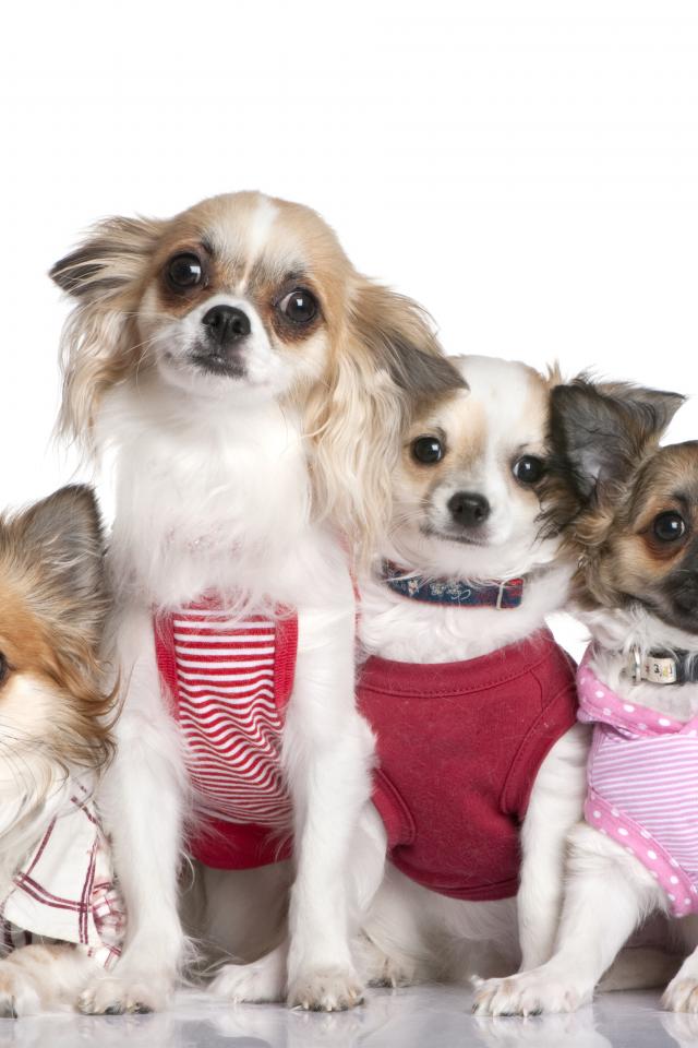 Обои Четыре собаки породы чихуахуа в костюмах на белом фоне