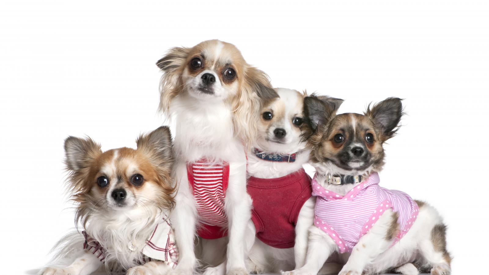 Обои Четыре собаки породы чихуахуа в костюмах на белом фоне
