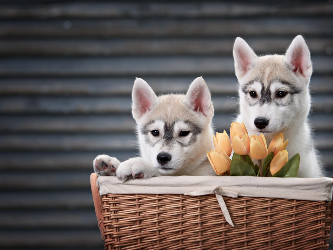 Обои Два маленьких щенка хаски в корзине с тюльпанами