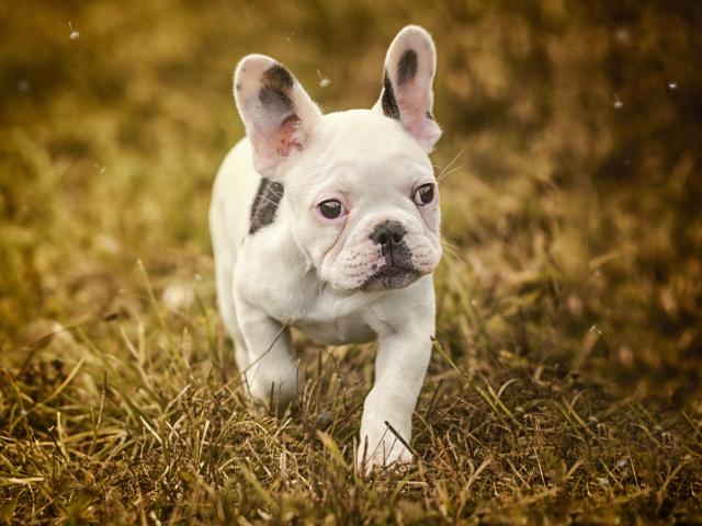 Обои Маленький белый щенок французского бульдога идет по траве
