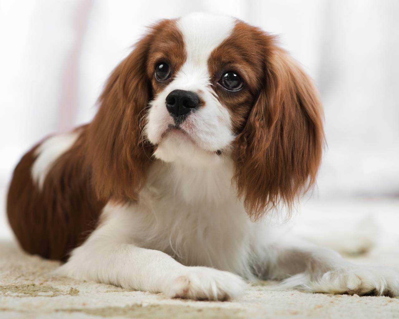 Обои Кавалер кинг чарльз спаниель лежит на песке