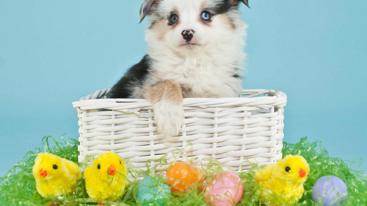 Обои Маленький щенок в корзине с пасхальными яйцами и цыплятами