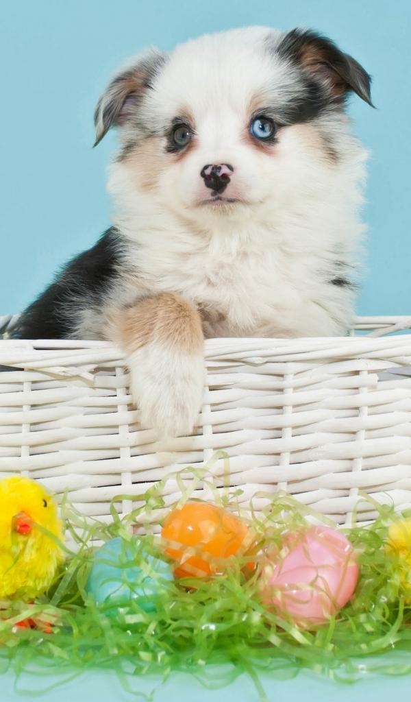 Обои Маленький щенок в корзине с пасхальными яйцами и цыплятами