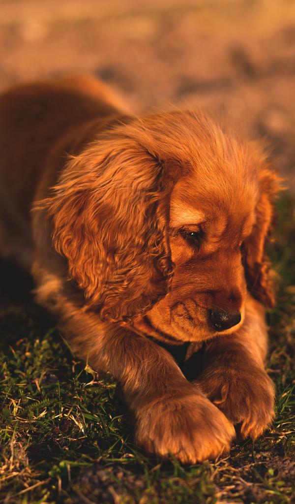 Обои Грустный щенок кокер спаниеля лежит на траве