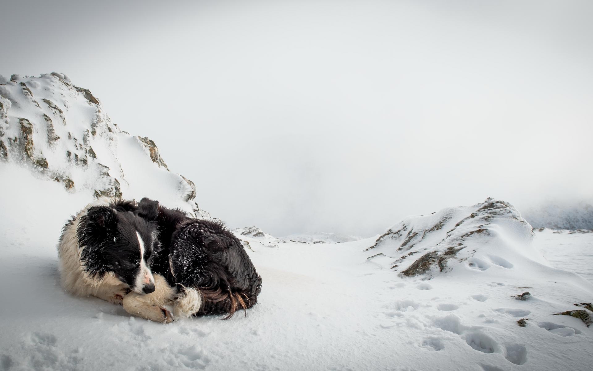 Обои Грустная собака спит на снегу зимой