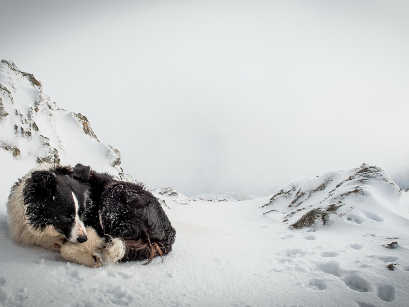 Обои Грустная собака спит на снегу зимой